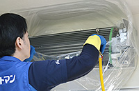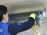 作業前に動作確認を行います。その後、周囲に汚れが飛び散らないように養生をし、フィルターや前面パネルなどを取り外します。