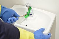 トイレタンクの水受け、蛇口などをブラシやスポンジを使用して洗浄します。
