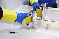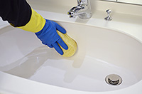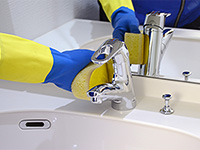 洗面器についた水垢や汚れをブラシ、スポンジを使用して専用洗剤で洗浄します。