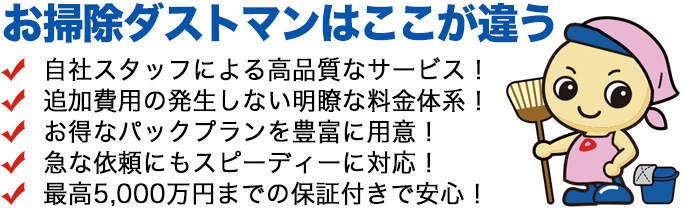 お掃除ダストマンでは、千葉県をはじめ関東エリアを対象に、低価格・高品質なハウスクリーニングサービスを提供しております。他のハウスクリーニング会社のような、依頼を受けたら後は下請けに任せっきり、ということはいたしません。自社で厳しい研修を受けた経験豊富なプロスタッフが作業担当し、作業完了まで責任を持って対応いたしますので、ご安心ください。お掃除のプロが、あなたご自宅やオフィスの気になる汚れを徹底的にキレイにします。